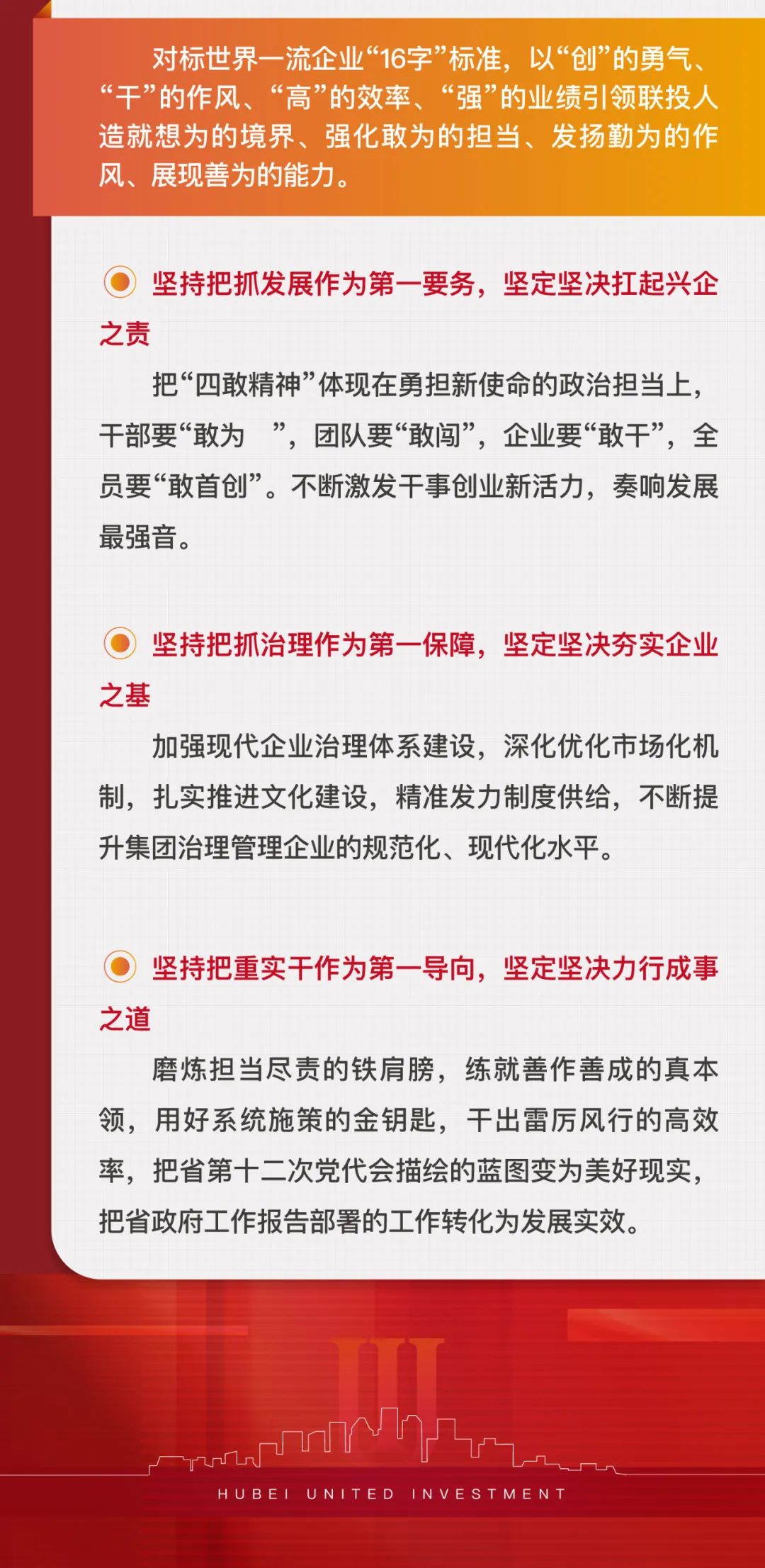 實(shí)干創(chuàng)造歷史,奮斗成就未來。新征程上惟有不懈奮斗,方能不負(fù)時(shí)代。湖北聯(lián)投將在省委省政府的堅(jiān)強(qiáng)領(lǐng)導(dǎo)下,厚植發(fā)展動(dòng)能,勇?lián)刃惺姑?,踔厲奮發(fā)、勇毅前行,以建功“先行區(qū)”的政治自覺和爭(zhēng)當(dāng)“先行軍”的行動(dòng)自覺,奮力開啟聯(lián)投“二次創(chuàng)業(yè)”新征程,譜寫創(chuàng)建一流企業(yè)新篇章!