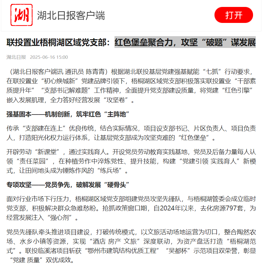 近日,聯(lián)投置業(yè)梧桐湖區(qū)域黨支部以紅色堡壘聚合力,攻堅(jiān)“破題”謀發(fā)展,獲湖北日報(bào)專題報(bào)道,全文轉(zhuǎn)載如下: