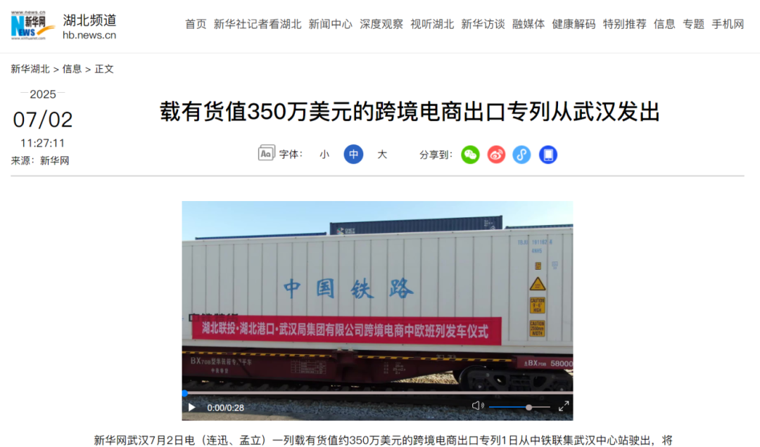 7月1日下午17時,一列滿載湖北聯(lián)投國際經(jīng)合跨境電商商品的出口專列,從武漢吳家山站駛出,沿“漢新歐”國際鐵路干線駛向中東歐核心物流樞紐——波蘭馬拉舍維奇,全程運輸時間預(yù)計18天。專列整合了來自浙江、廣東、河北、江蘇等全國多省貨源,涵蓋工業(yè)品、建材、3C電子產(chǎn)品等多品類。專列的成功開行,標志著湖北國際經(jīng)合在拓展跨境物流服務(wù)品類、構(gòu)建消費品出海通道上取得重要突破。