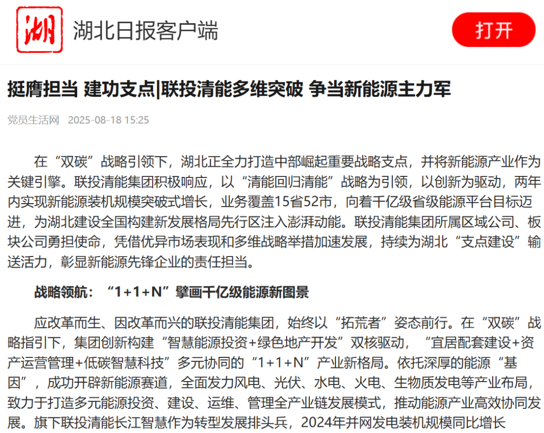 科技賦能產(chǎn)業(yè)革新,綠色引領高質(zhì)量發(fā)展。集團官微特別推出《挺膺擔當 建功支點》專欄系列報道,第17期聚焦聯(lián)投清能集團以“清能回歸清能”戰(zhàn)略為引領,通過構建“1+1+N”產(chǎn)業(yè)新格局、實施五大引擎驅(qū)動項目攻堅、深耕荊楚大地助力中部崛起的生動實踐,展現(xiàn)其爭創(chuàng)省級能源平臺、服務國家戰(zhàn)略的先鋒作為,為湖北支點建設注入強勁“綠動能”,書寫共建“美麗中國”的聯(lián)投答卷。