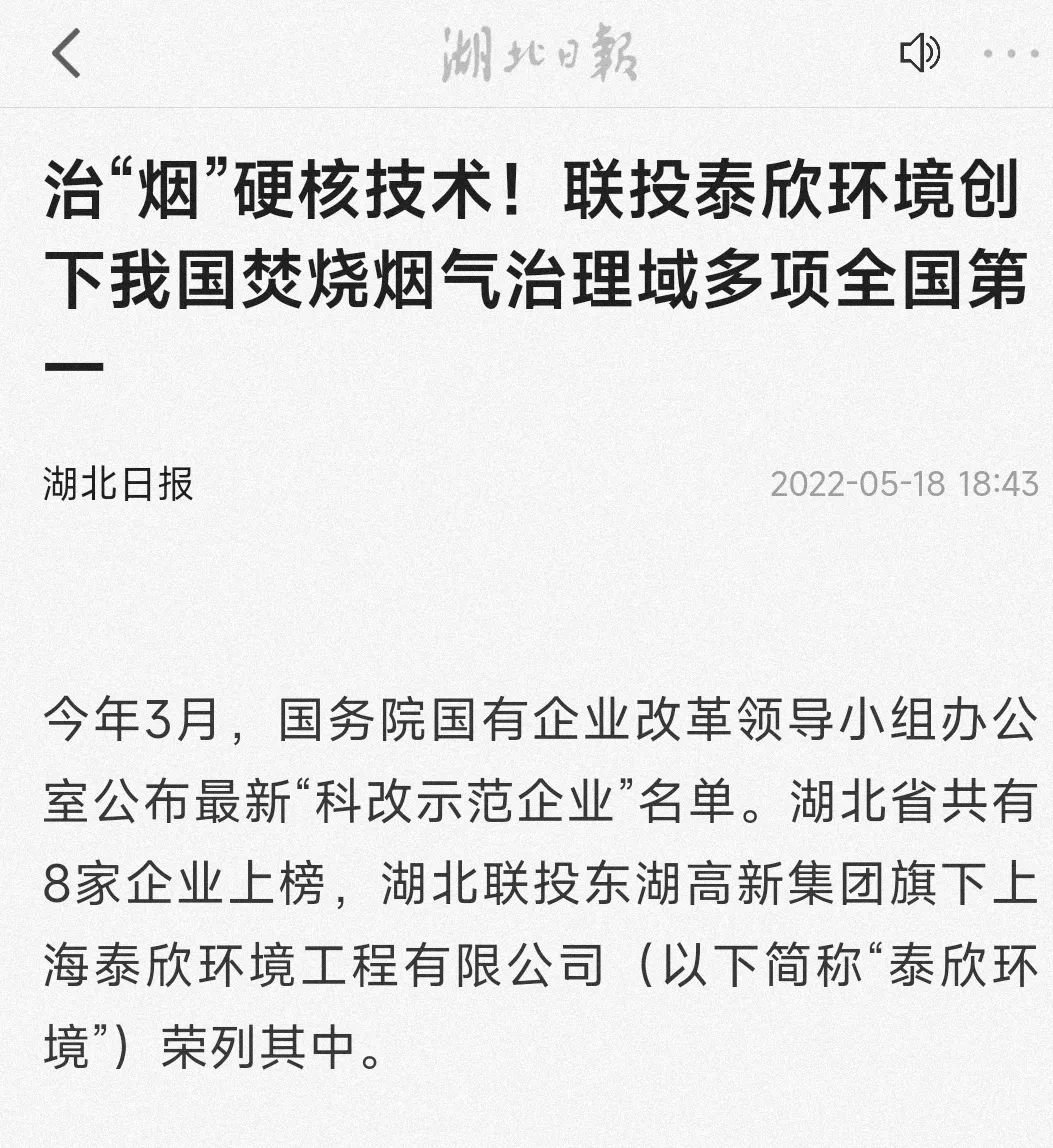 今年3月,國務(wù)院國有企業(yè)改革領(lǐng)導(dǎo)小組辦公室公布最新“科改示范企業(yè)”名單。湖北省共有8家企業(yè)上榜,東湖高新集團(tuán)旗下上海泰欣環(huán)境工程有限公司(以下簡稱“泰欣環(huán)境”)榮列其中。